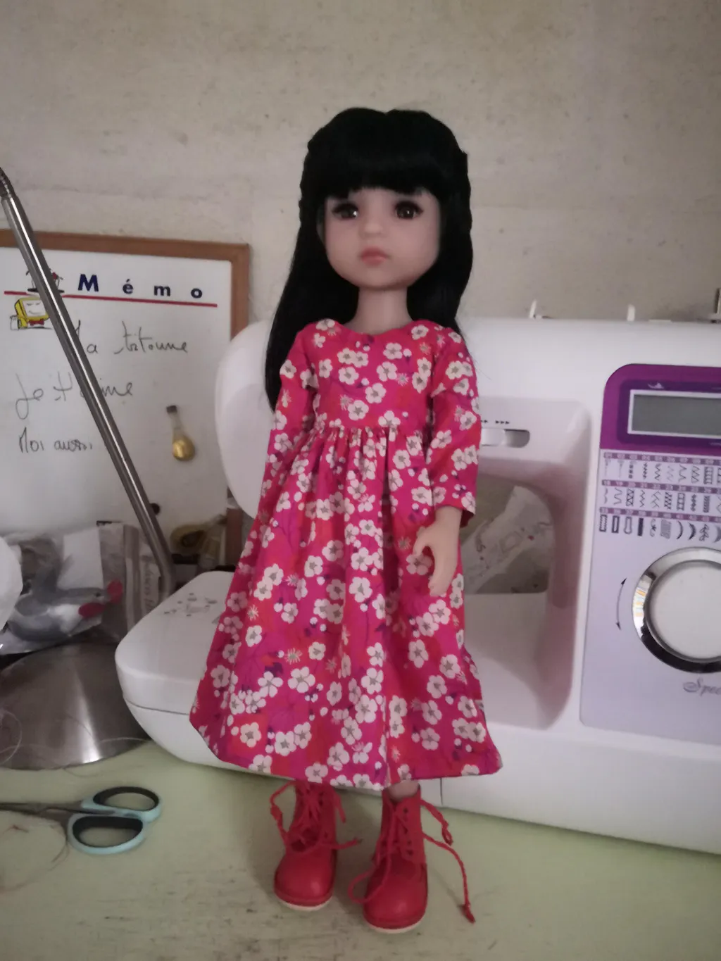 • Doll in a stylish outfit with a handbag in a room with clothing and accessories.