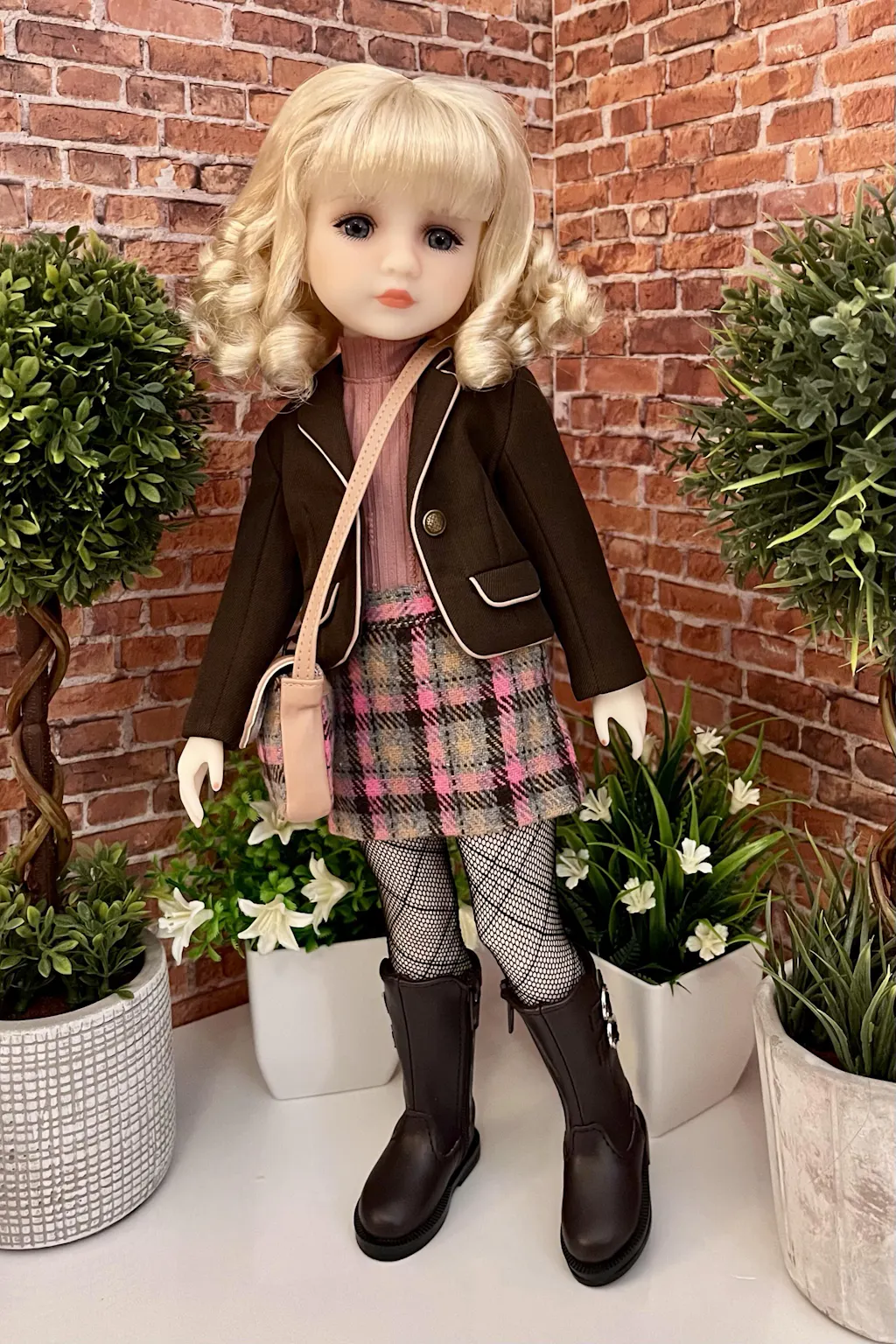 • Doll wearing a textured beige jacket and brown skirt in a room with mannequins and clothing.