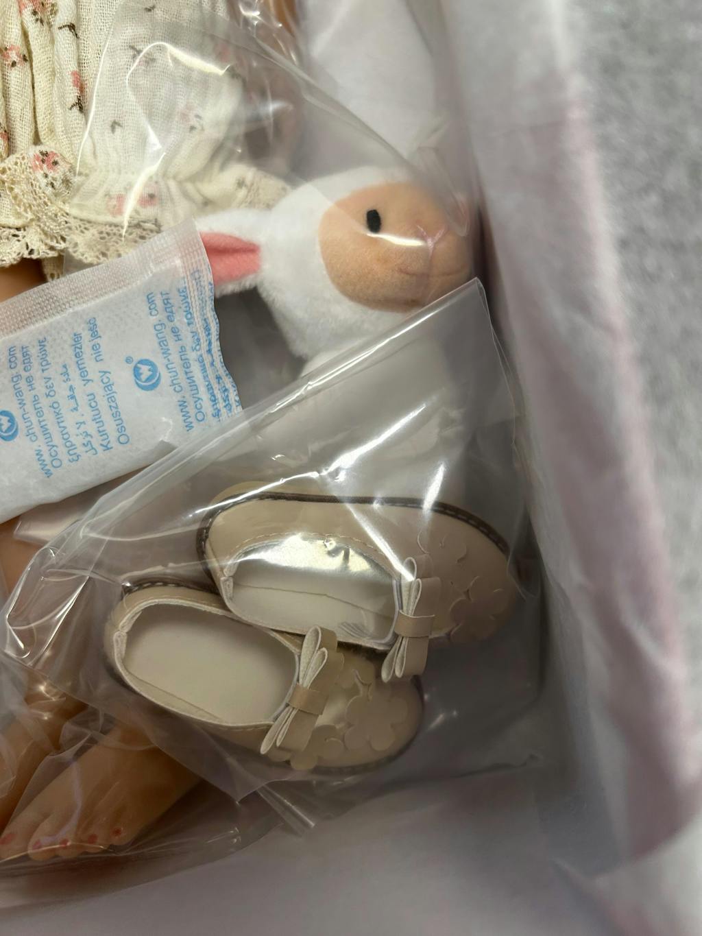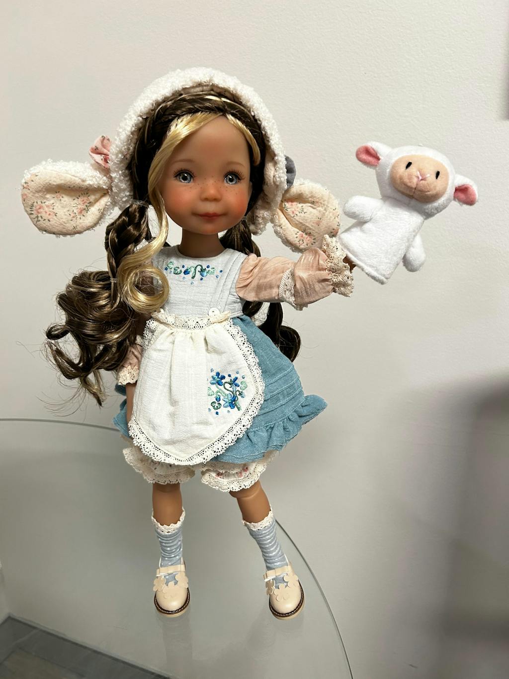 Ihre lustigen, ungleichen blauen Socken – mit Punkten und Streifen – passen perfekt zu ihren schicken beigefarbenen Mary-Jane-Schuhen, die mit süßen Schleifen und Blümchen verziert sind. Und als i-Tüpfelchen trägt sie eine niedliche Schafmütze mit Schleifen – perfekt für ihre Frühlingsabenteuer.