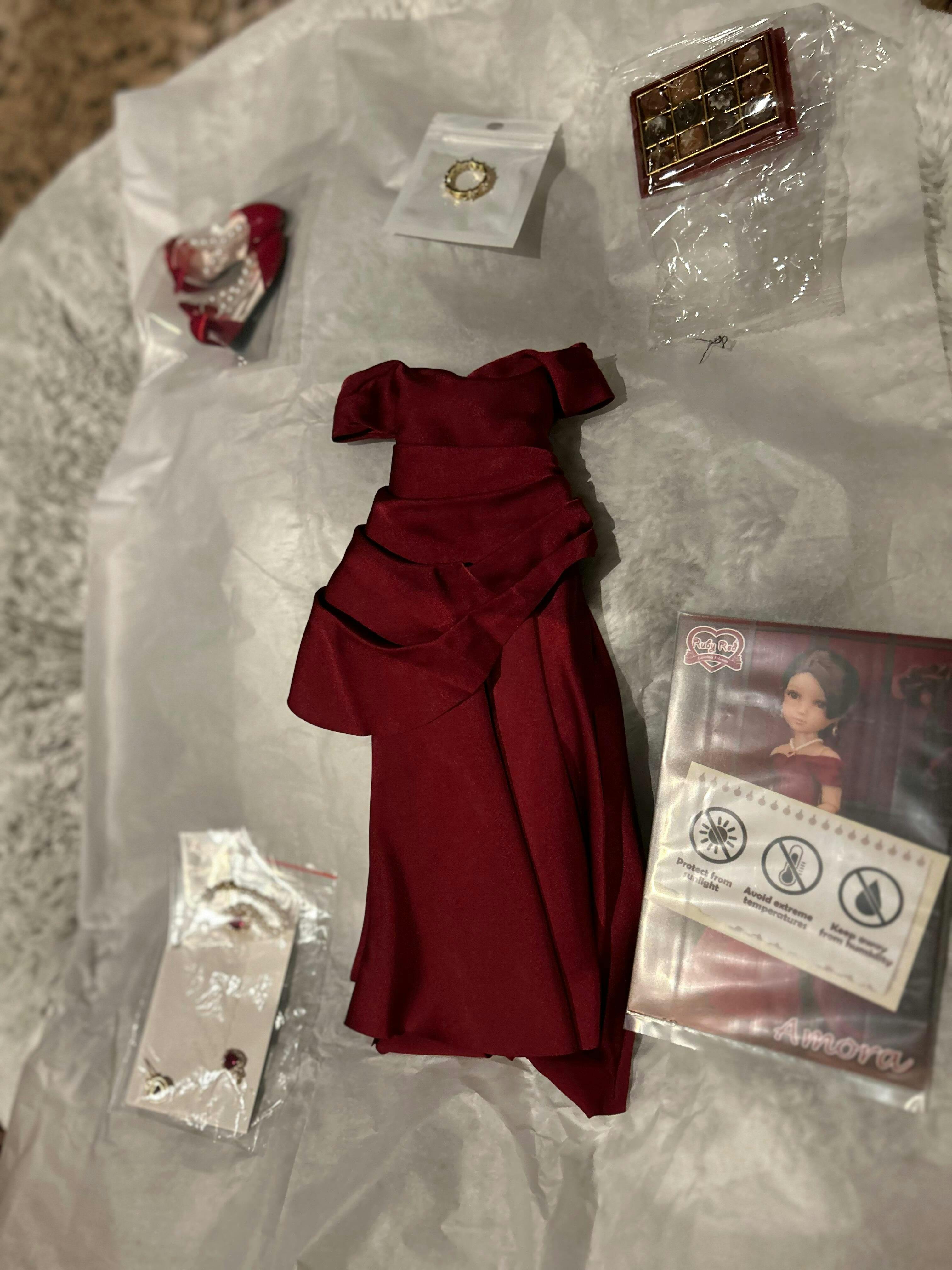 ¡Conoce a Amora, la personificación de la elegancia este San Valentín! Luce un impresionante vestido rojo intenso, largo hasta el suelo, con hombros descubiertos, un sutil escote en forma de corazón y un favorecedor fruncido en la cintura que realza su look de alfombra roja. El vestido fluye con una hermosa caída y una cautivadora cola, convirtiéndola en la estrella de cualquier ocasión romántica.