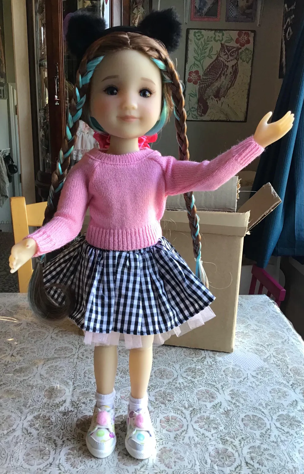 Consiste en un suéter rosa corto y una falda a cuadros blancos y negros. Los accesorios incluyen una diadema de gatito peludo, calcetines blancos y las zapatillas con pompones más monas del mercado.