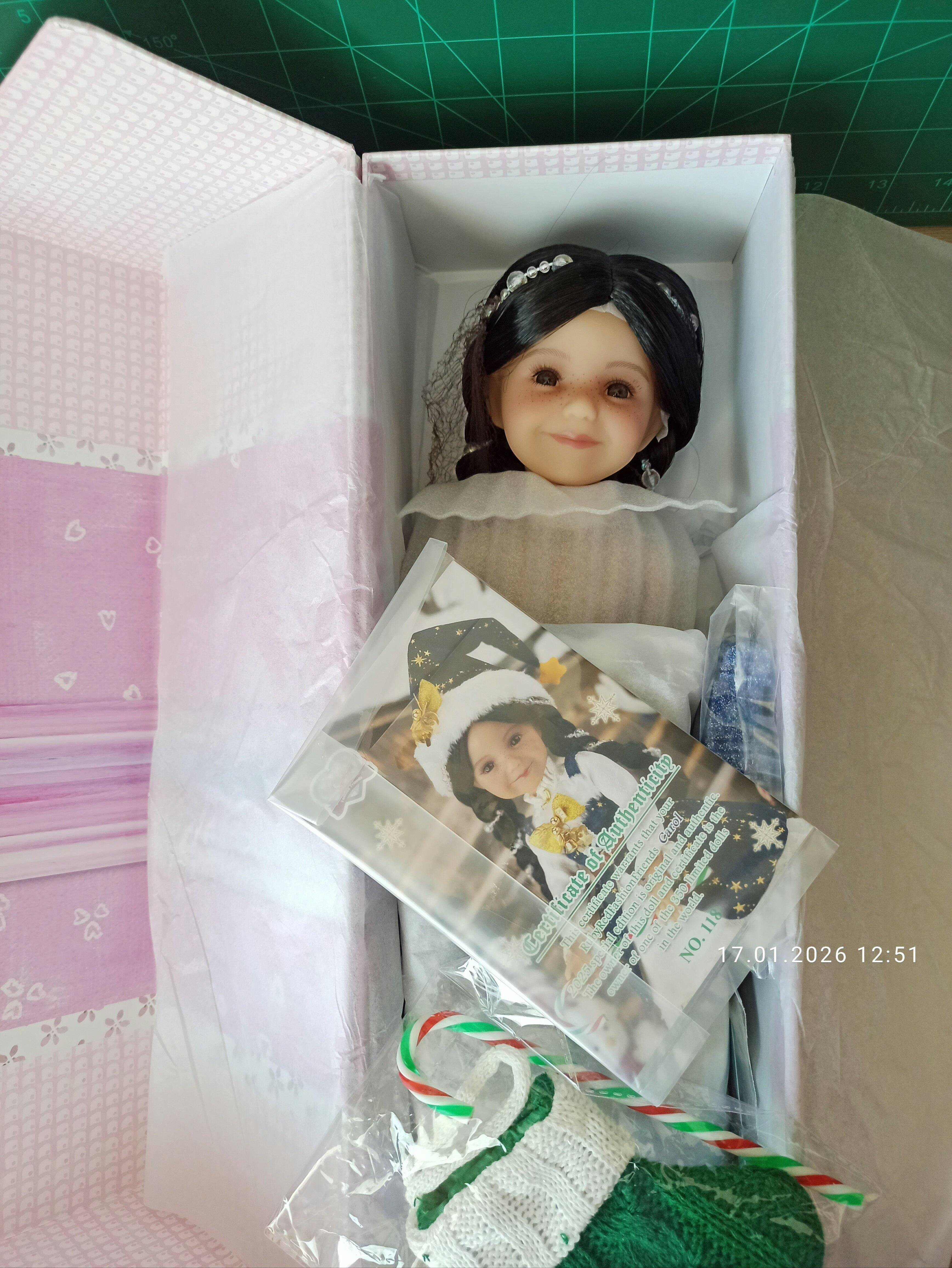 La encantadora personalidad de Carol se refleja en su cálida sonrisa y sus adorables pecas, que se complementan a la perfección con su cabello negro trenzado adornado con cuentas brillantes. Luce un festivo sombrero navideño coronado con una campanita dorada, que realza su espíritu alegre. Con una acogedora bolsita de punto en la mano, llena de dulces navideños y un bastón de caramelo para compartir alegría, está lista para todas tus aventuras festivas.
