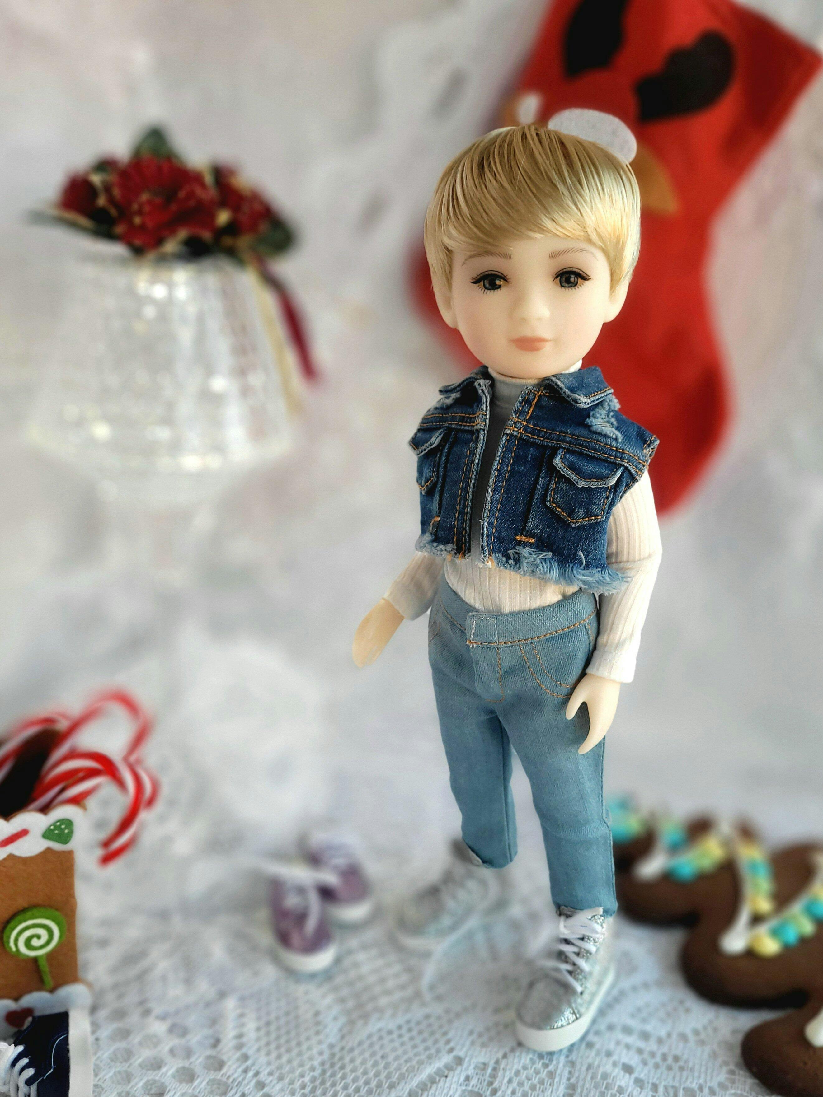 Inga K This outfit is a real find! The denim vest, though tiny, is incredibly detailed. You can see every stitch and every rivet. The silver sneakers are like miniature versions of real sneakers! Each piece looks great on its own, but together they create a complete and interesting outfit. This outfit is a great choice!