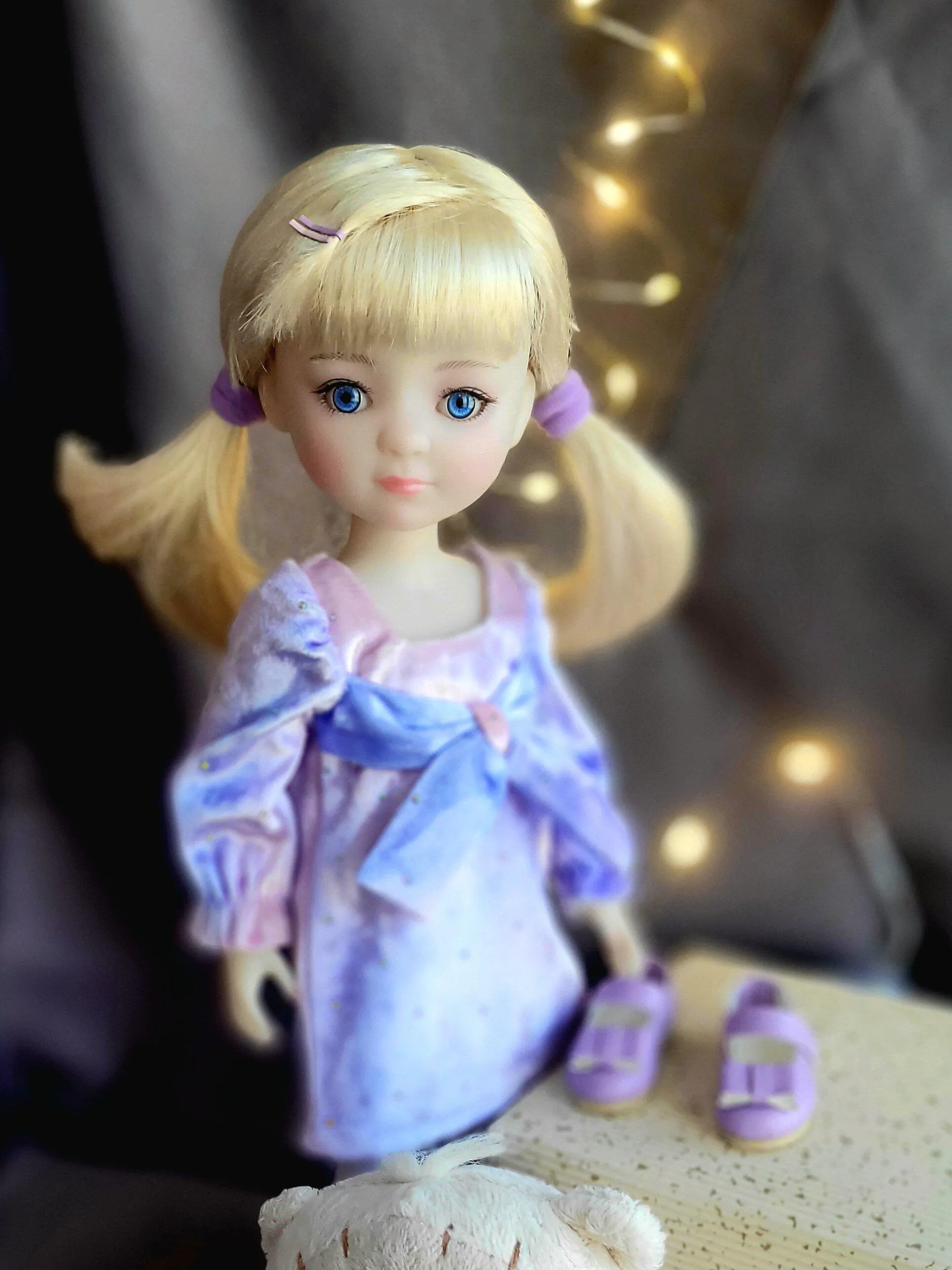 Doll wearing a purple tie-dye dress with a bow on a white background