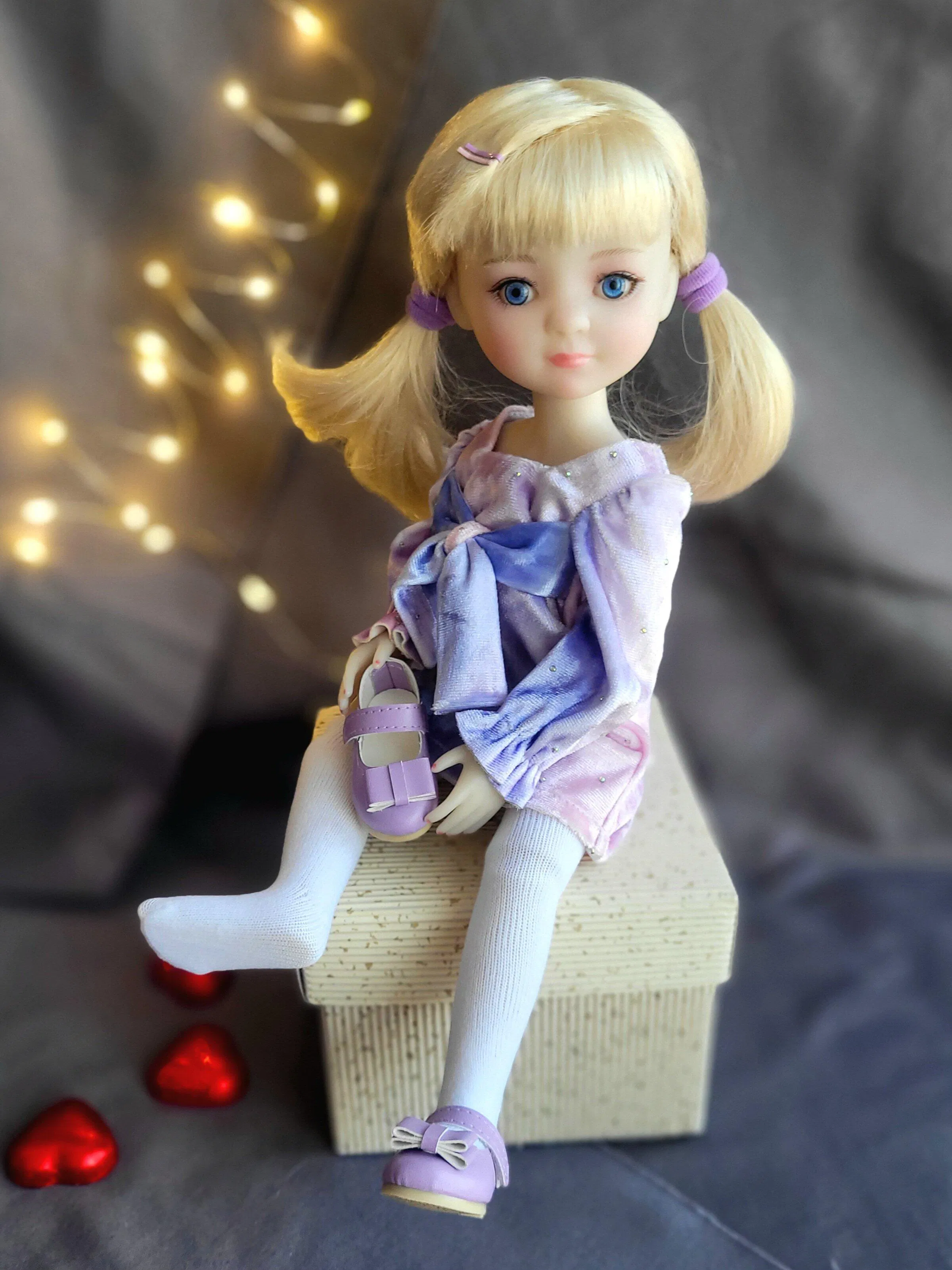 Doll wearing a white jacket, purple skirt, and silver shoes on a white background 8" mini Freida