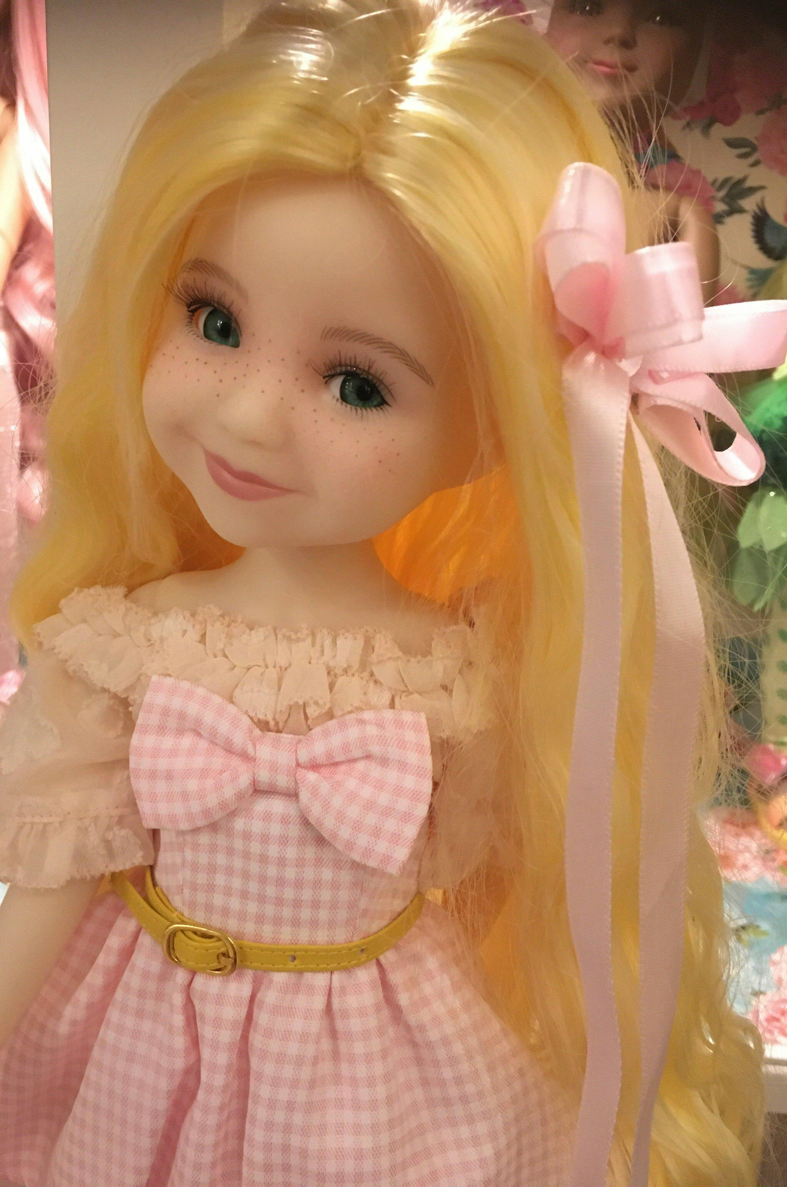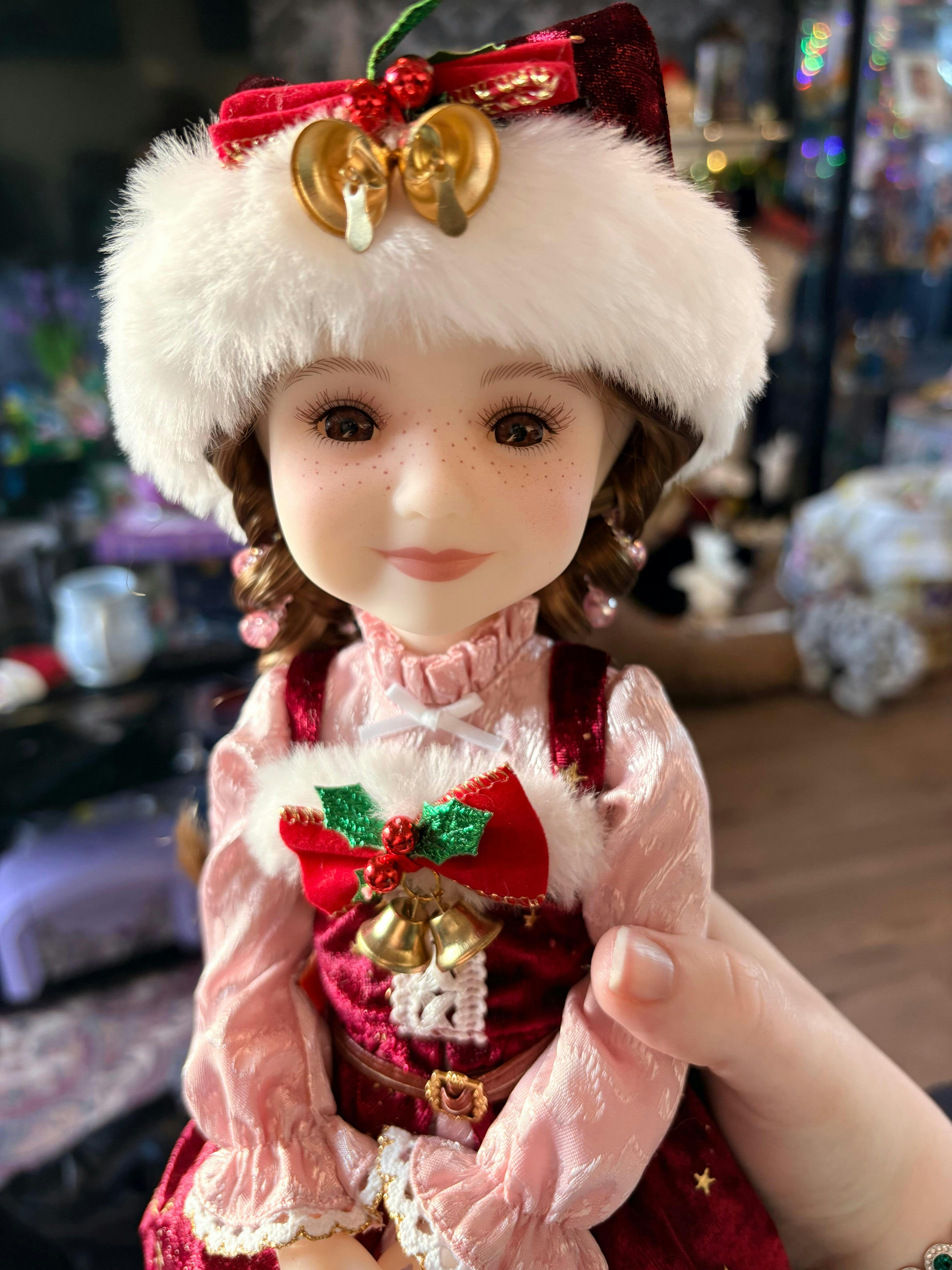 She is very cute. I love her Christmas outfit; the pink dress is beautiful and excellent in any time. Her face looks so happy with her sweet smile and that's lovely! I like her color hair and her cute freckles. A wonderful doll! Thank you! ❤️