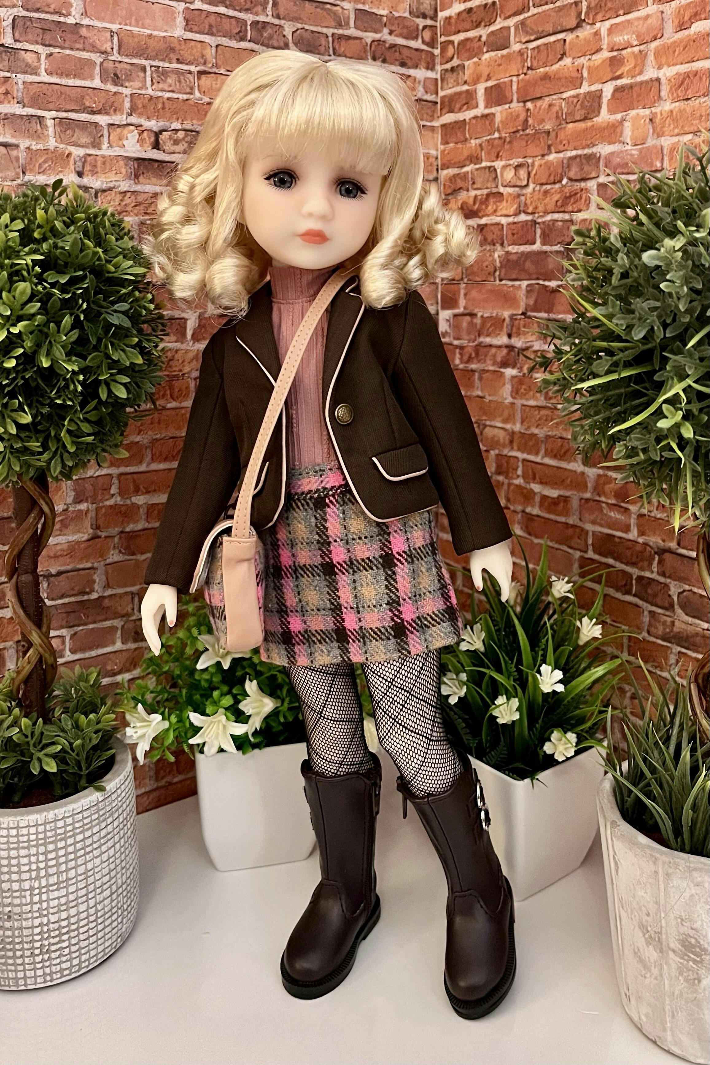 • Doll wearing a tweed jacket and brown skirt in a blurred indoor setting