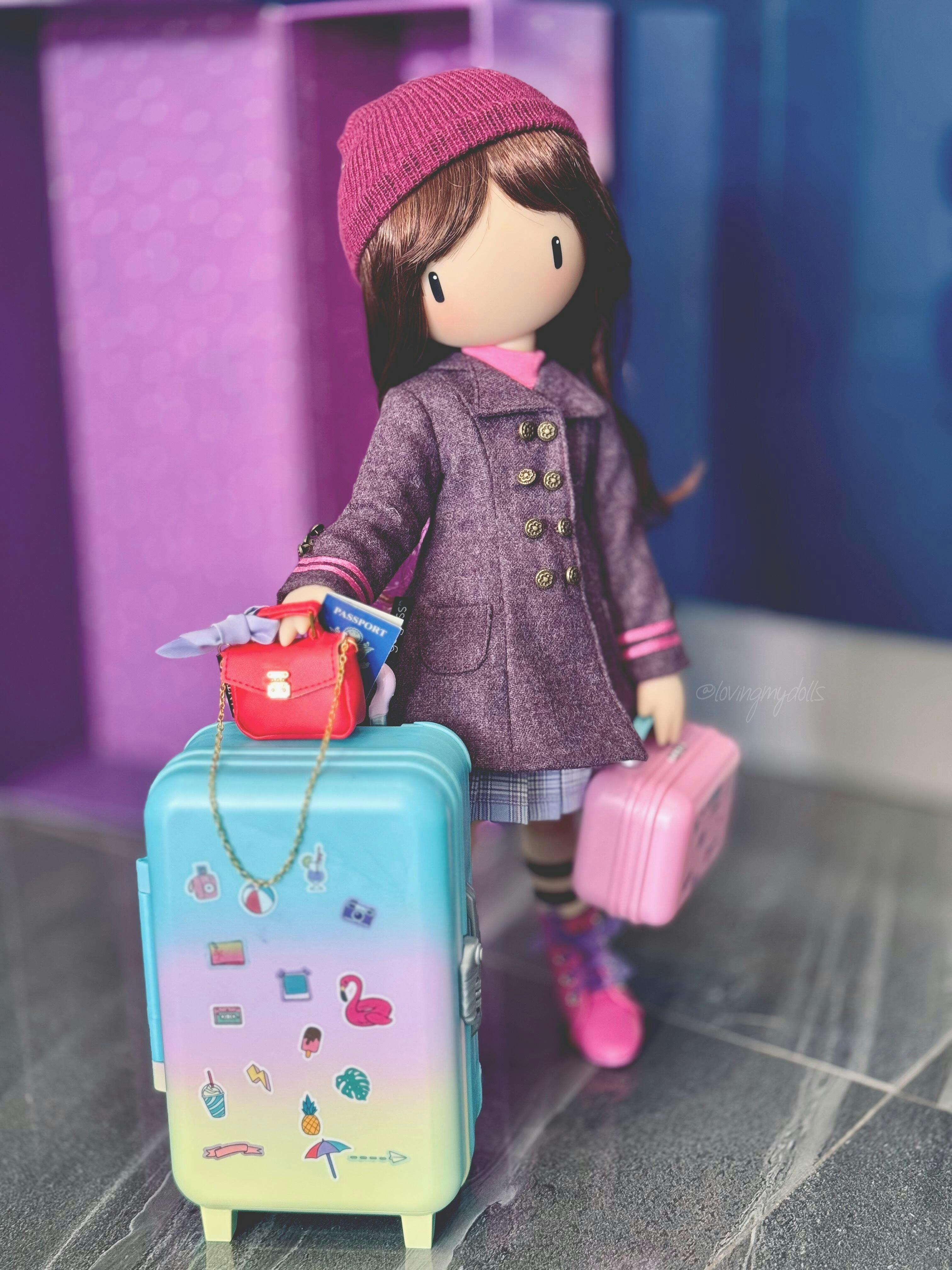 Gorjuss doll wearing a purple coat, hat, and boots with a red bag on a white background