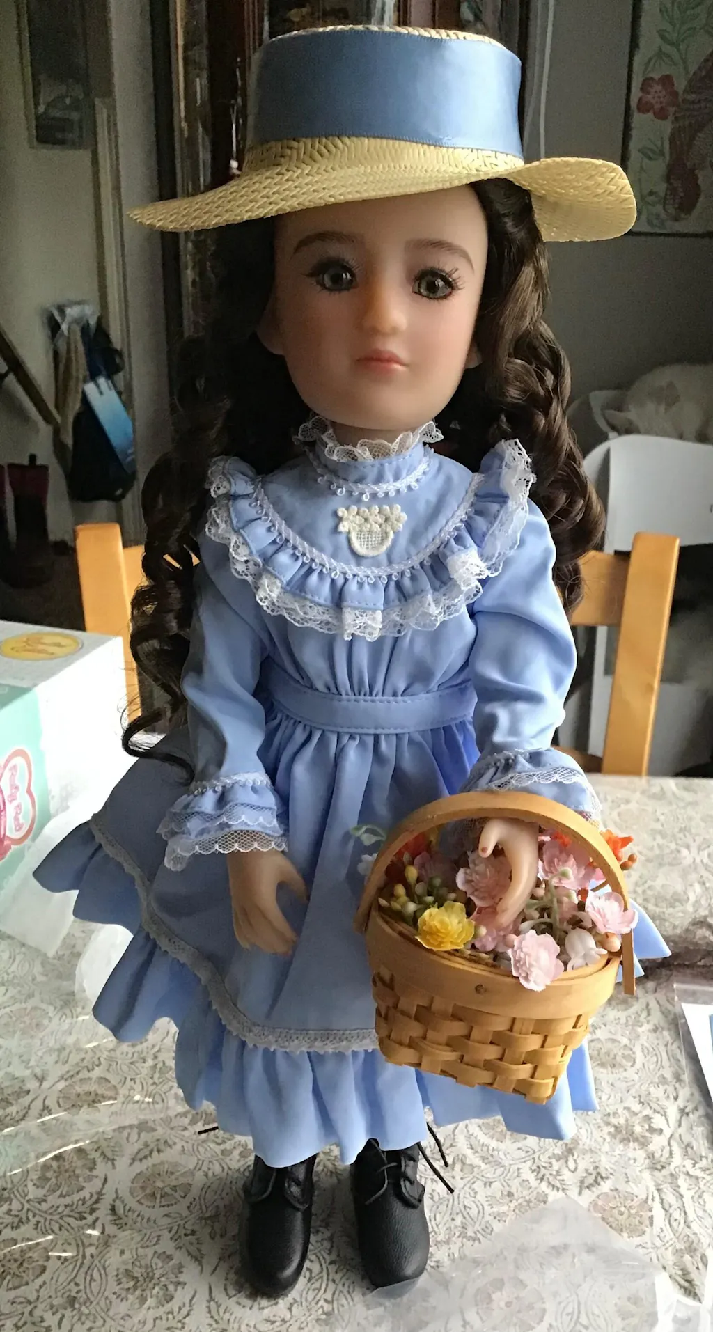Mary se distingue par ses longs cheveux châtain foncé, coiffés en une demi-queue de cheval ondulée, dont les douces ondulations encadrent son visage orné d'un nœud bleu pastel. Elle est ravissante dans une robe bleu pastel à manches longues, à col montant et délicate broderie florale blanche sur la poitrine. Un chapeau de paille plat, noué d'un nœud en soie, un legging blanc soyeux, des bottes noires à lacets et un panier de fleurs à la main complètent sa tenue.