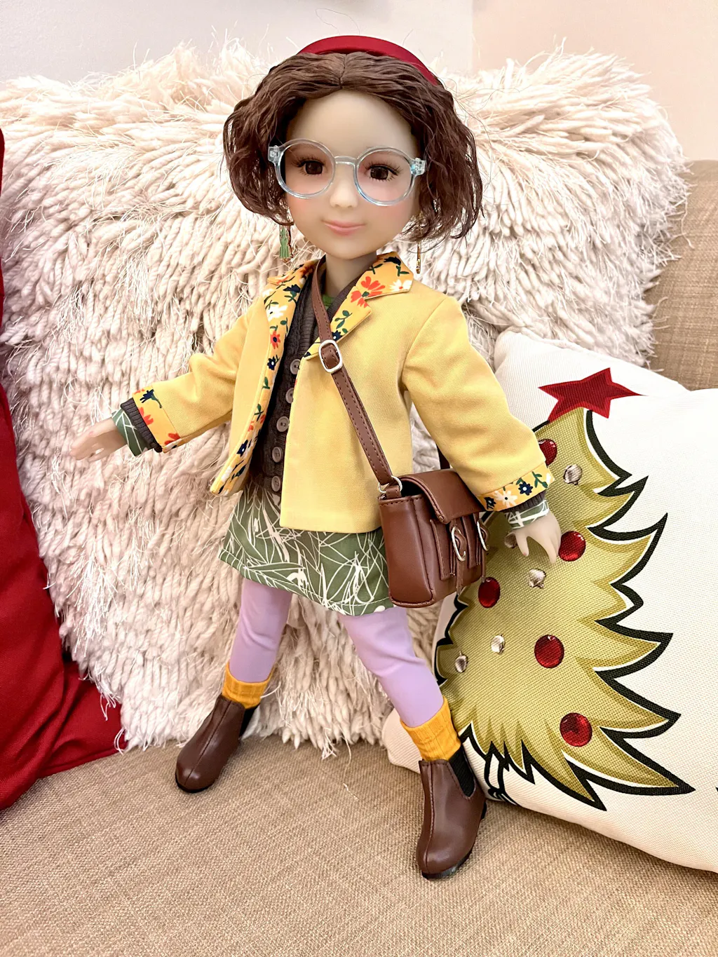 Ava has a distinctive and fashionable appearance. Her short wavy hair is accentuated by a red headband, and she wears trendy glasses and a pair of adorable frog earrings. Her outfit consisted of a green one-piece dress with grass print patterns, light purple leggings, orange socks, and dark brown slip-on boots. To keep warm and cozy, she has a grey cable cardigan and a yellow oversized jacket with an orange collar and cuffs adorned with vibrant floral patterns. Ava carries a cross-body bag allows her to bring her favorite books along.