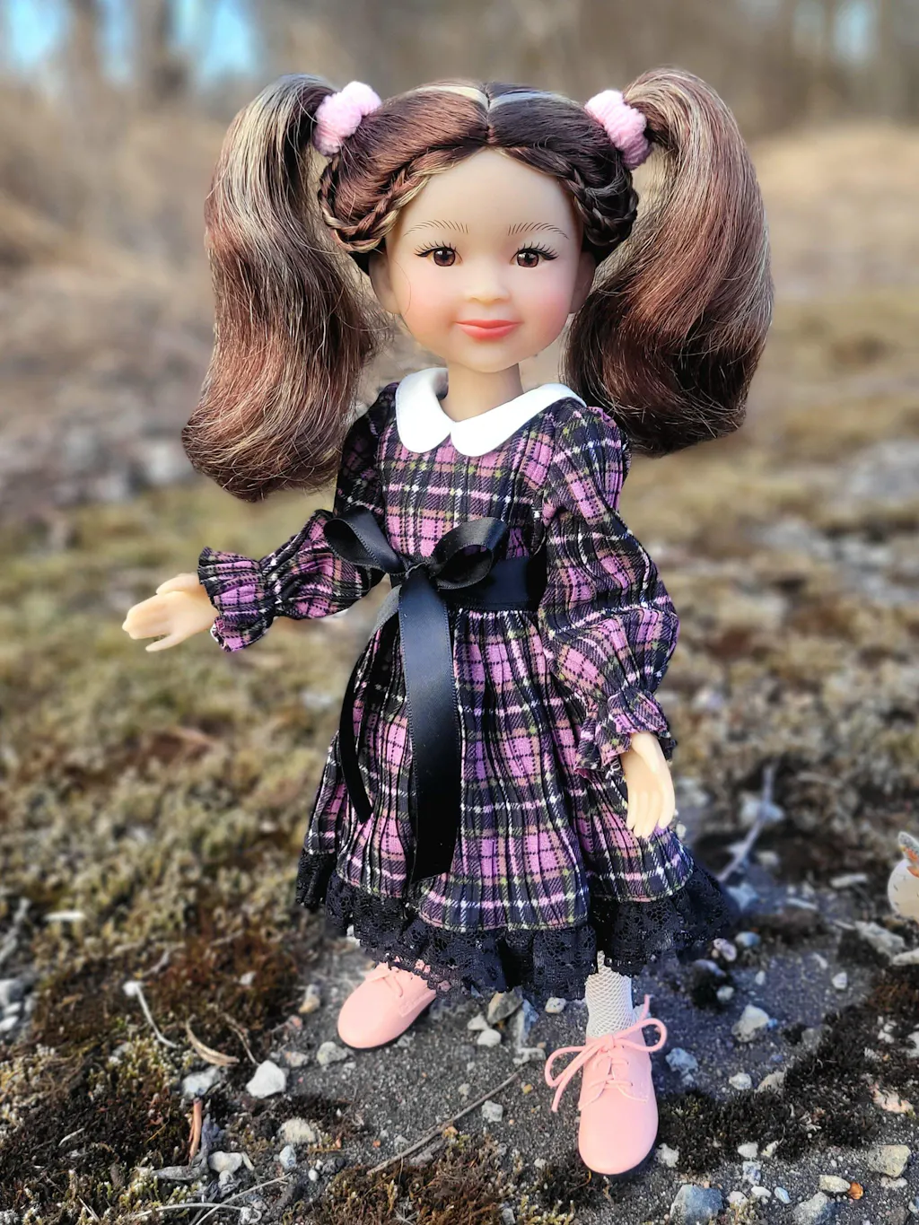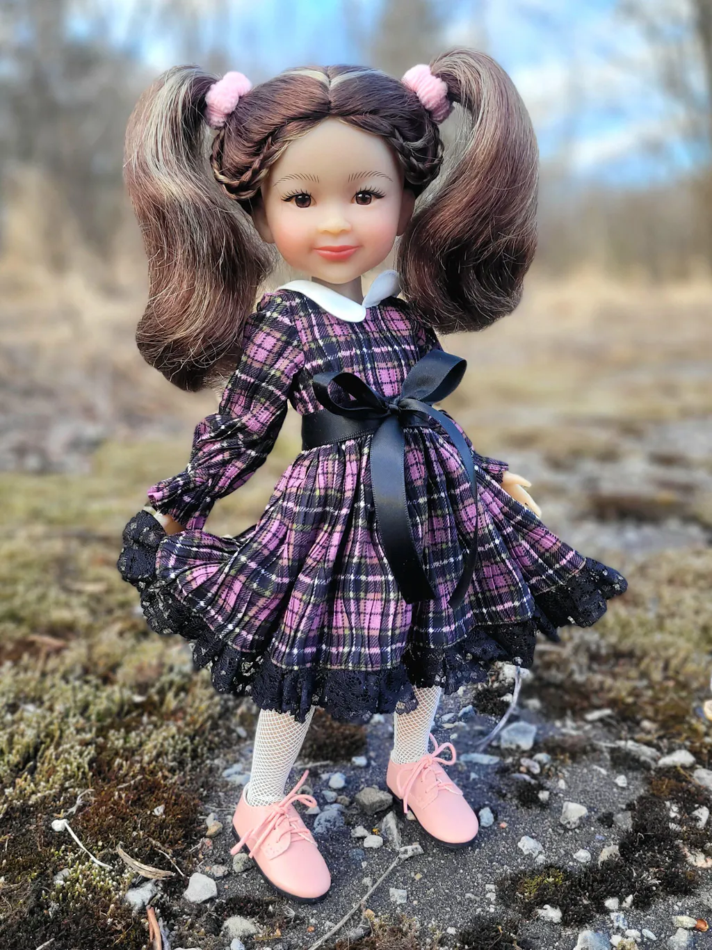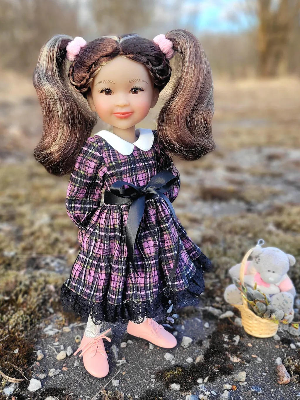 The elegant "Checker Charm" dress is a true work of miniature art. Every detail is meticulously crafted, creating a look that is both understated and charming. The crisp white collar, which lends a touch of classic sophistication to the dress, is particularly eye-catching. Its neat shape and impeccable white color provide a beautiful contrast to the checkered print. The long sleeves, adorned with delicate ruffles, add a touch of lightness and romance to the look. The black belt not only effectively completes the composition but also visually accentuates the doll-like figure. The hem of the dress is trimmed with black lace, adding volume and texture, completing the look and making it truly luxurious. Unfortunately, even such a beautiful creation has a small flaw. The interior of the dress is stitched with white thread. For all its apparent beauty, this detail somewhat "cheats" the overall impression, disrupting the perfect harmony of colors. I wish the reverse side matched such a wonderful design.