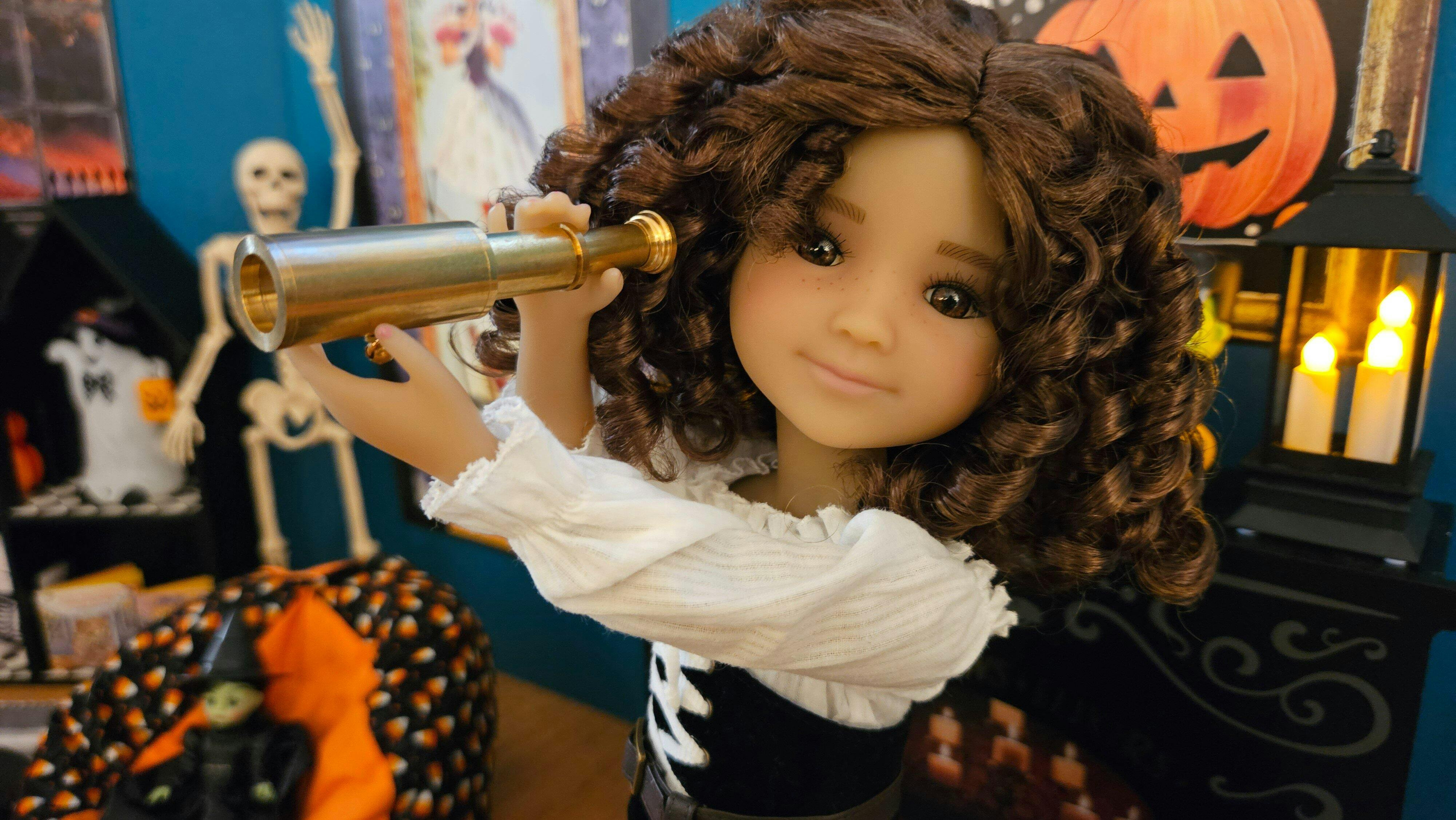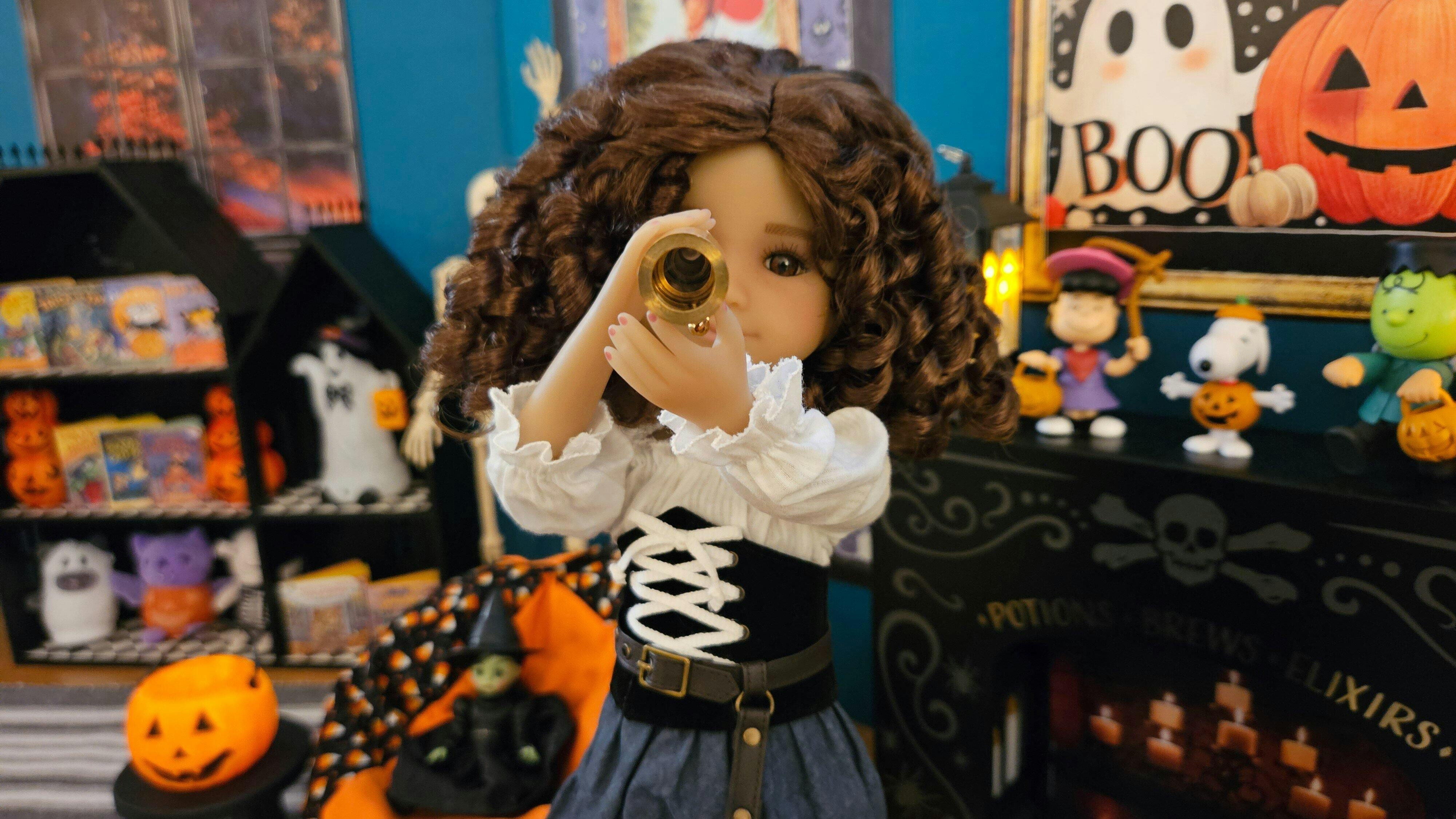 The long navy dress, adorned with intricate cake lace detailing, adds an enchanting touch of romance to her daring look. Completing the ensemble are brown boots and a vintage-feel belt, linked with a dress clip. Of course, no pirate is complete without a hat. Our Pirate Captain proudly wears a black suede hat adorned with a metal skeleton, adding mystery and intrigue to her appearance.