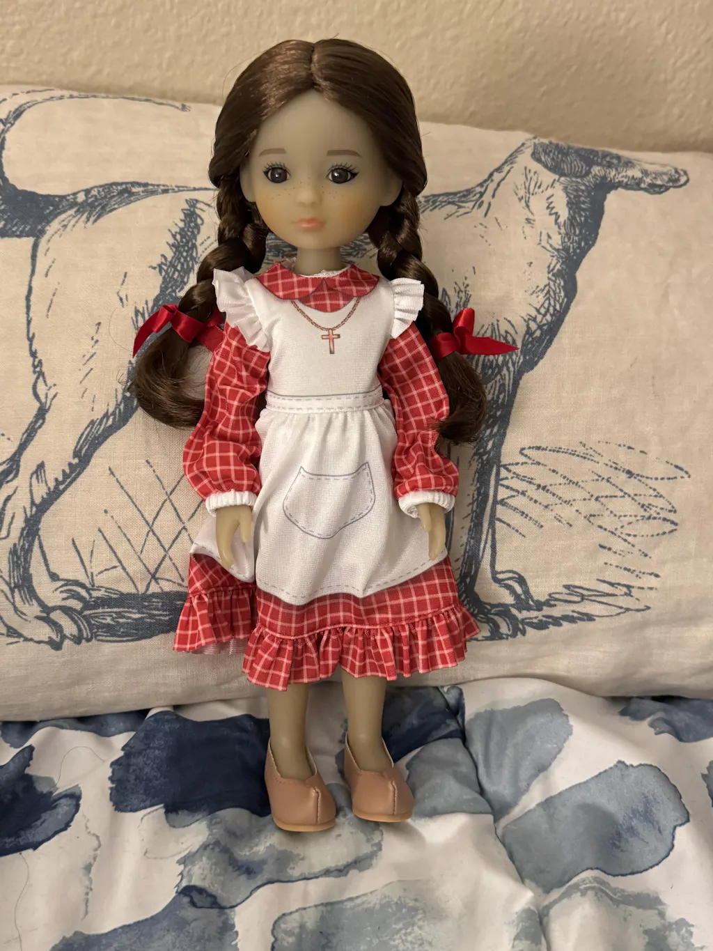 • Jeannette, a doll with braided brown hair and red bows, wears a red checkered dress with a white apron, a cross necklace, and brown shoes.