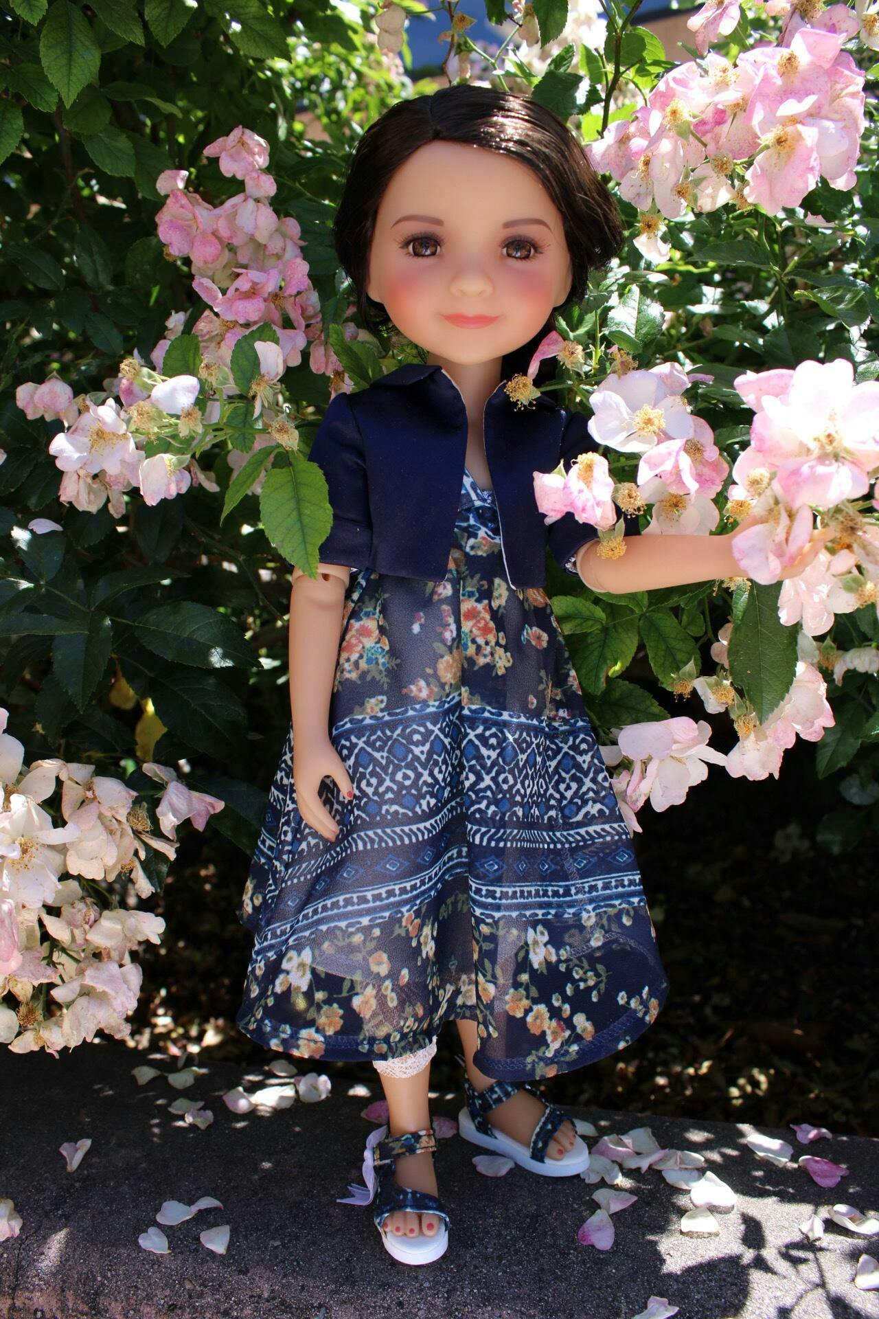 This outfit includes a blue mid-length floral sundress with a matching solid blue cap-sleeved cropped bolero jacket, lace tights, and a pair of printed gladiator sandals.
