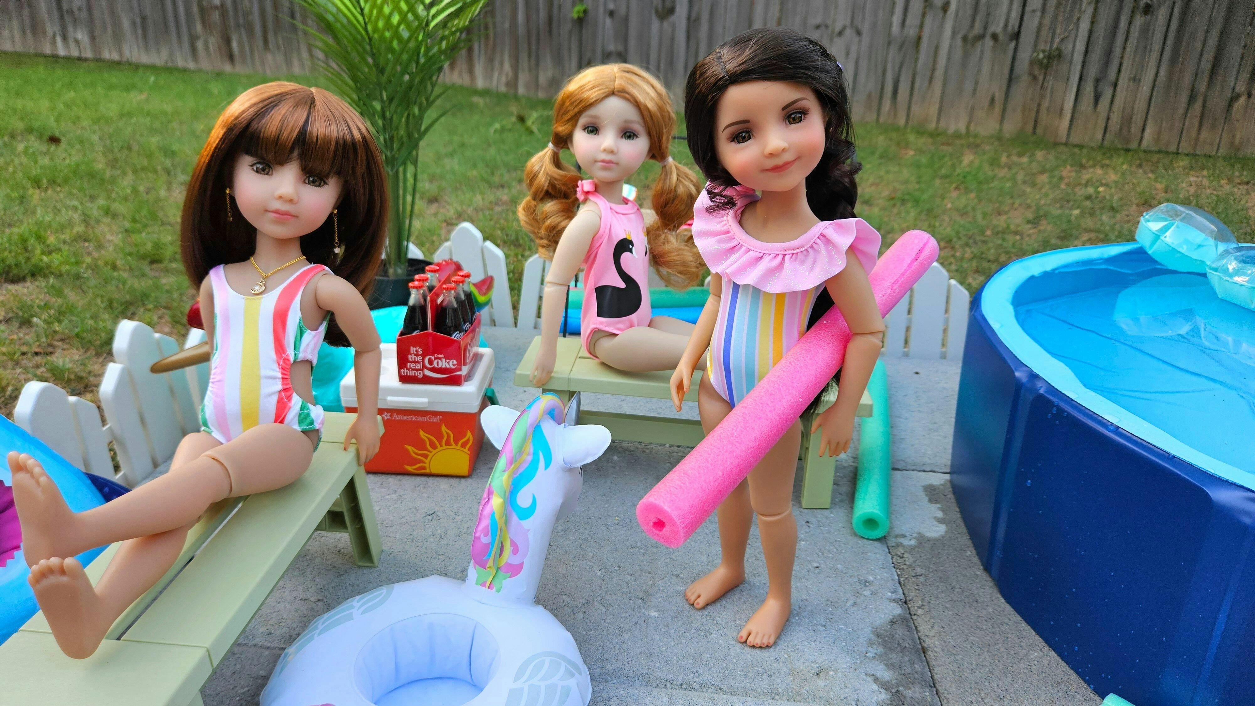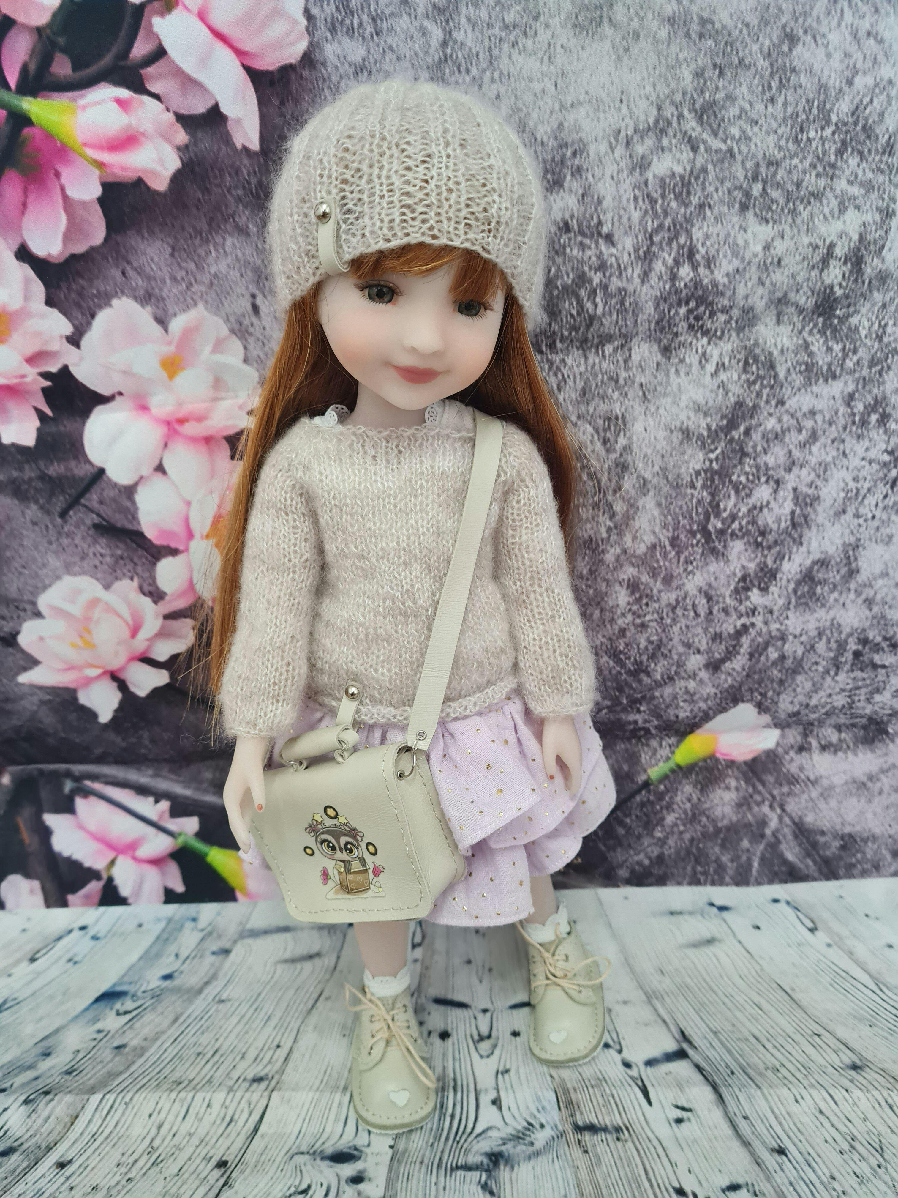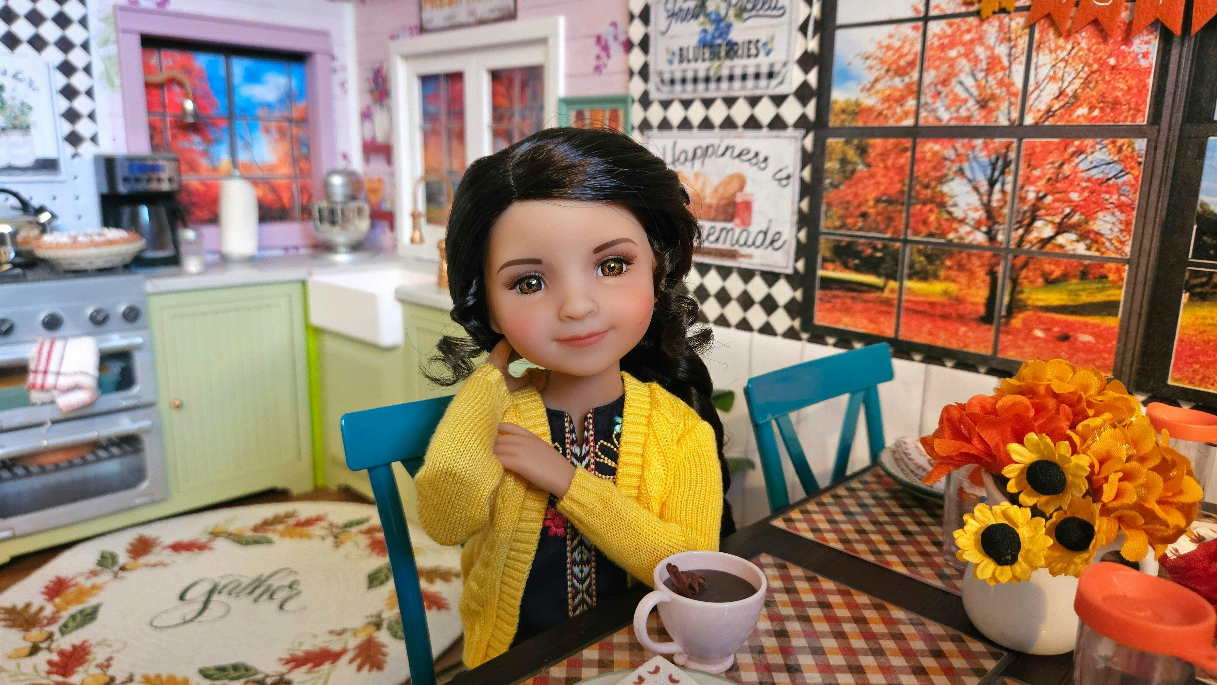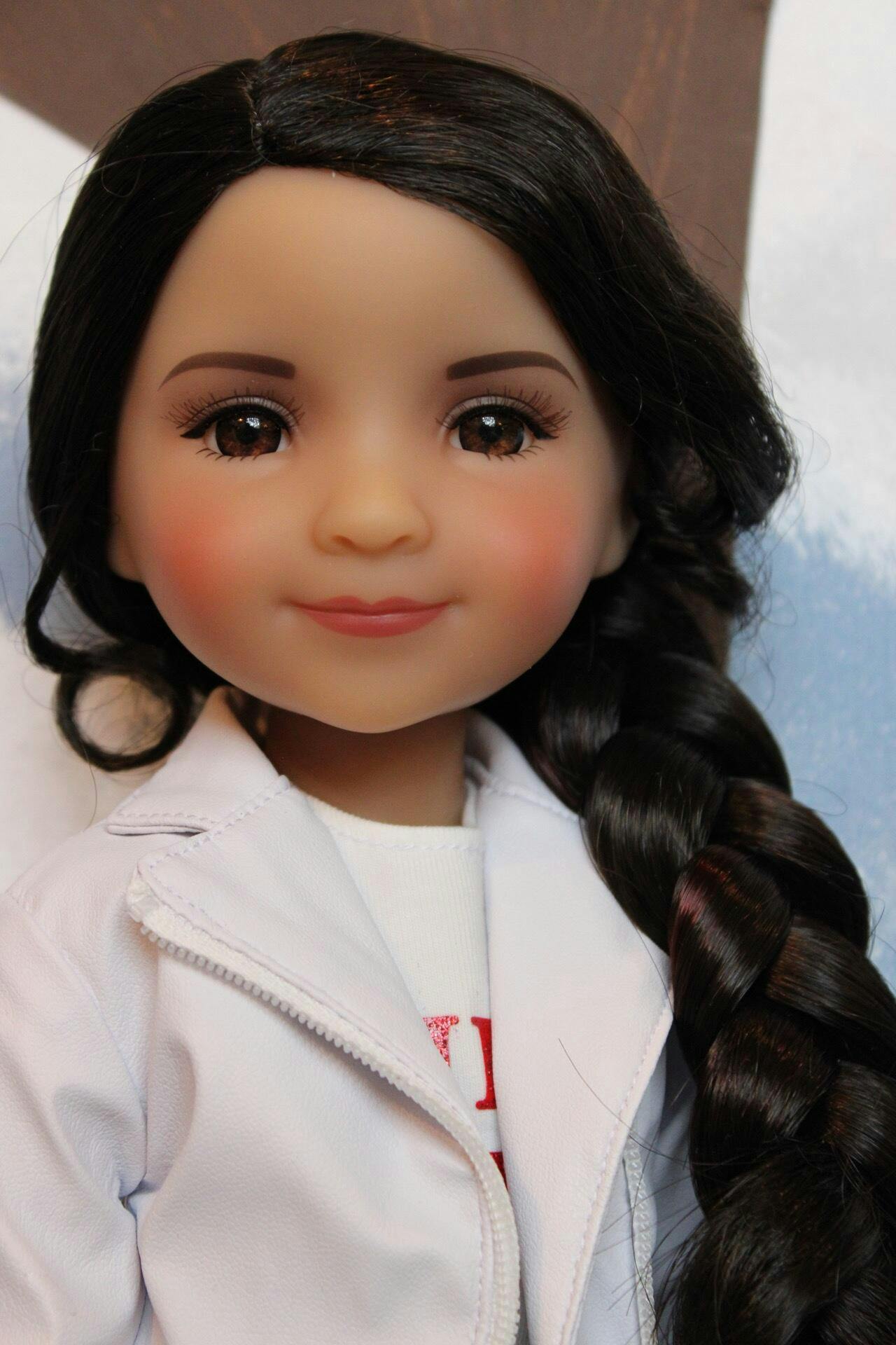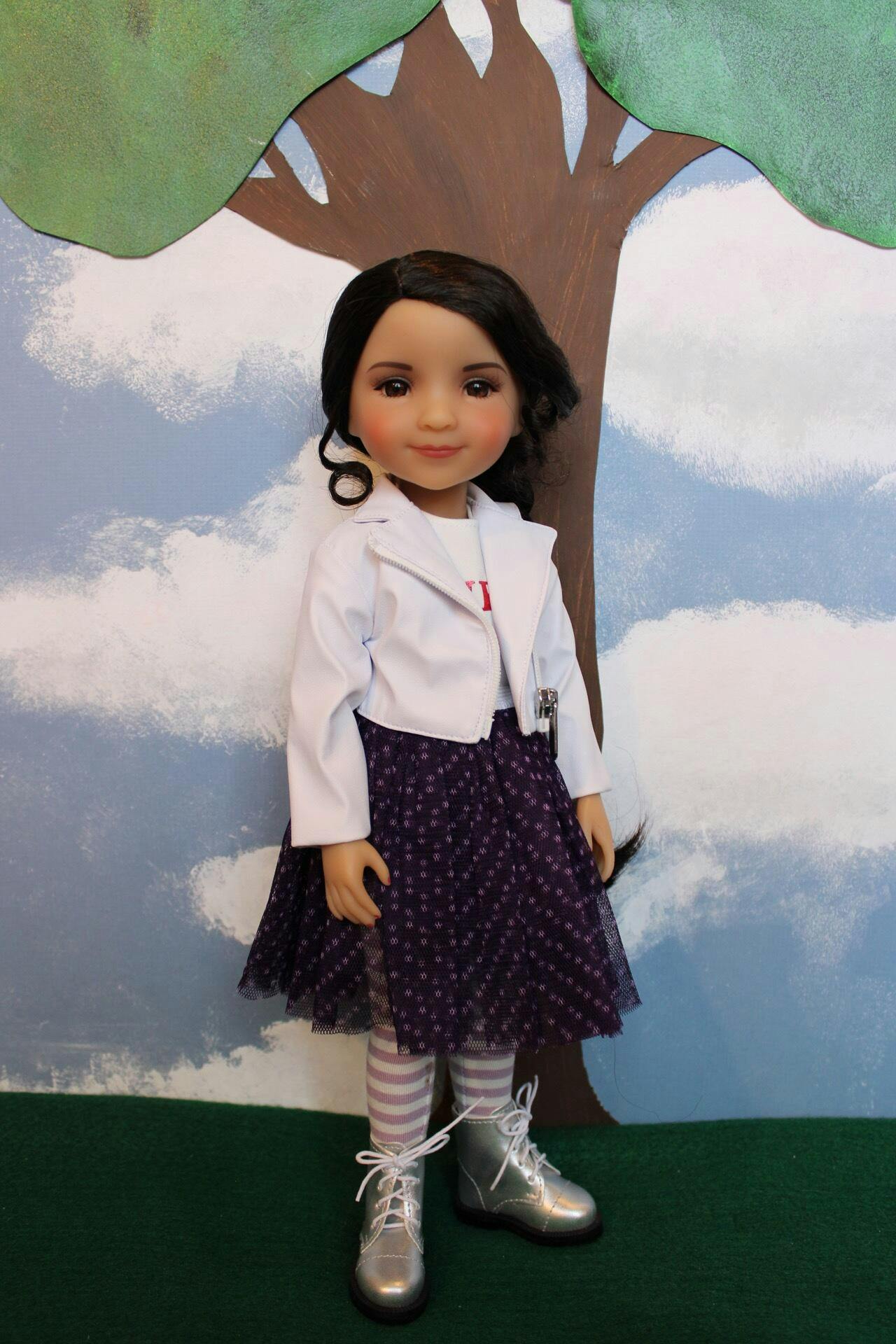 Freida features long dark brown hair that is pulled to the side in a long braid. She has beautiful deep eyes with a fiery center. She comes with her signature ‘Girl Power’ t-shirt, along with a white motorcycle jacket, lavender and white striped leggings, a purple tulle midi skirt with white polka dots, and silver high-top boots.
