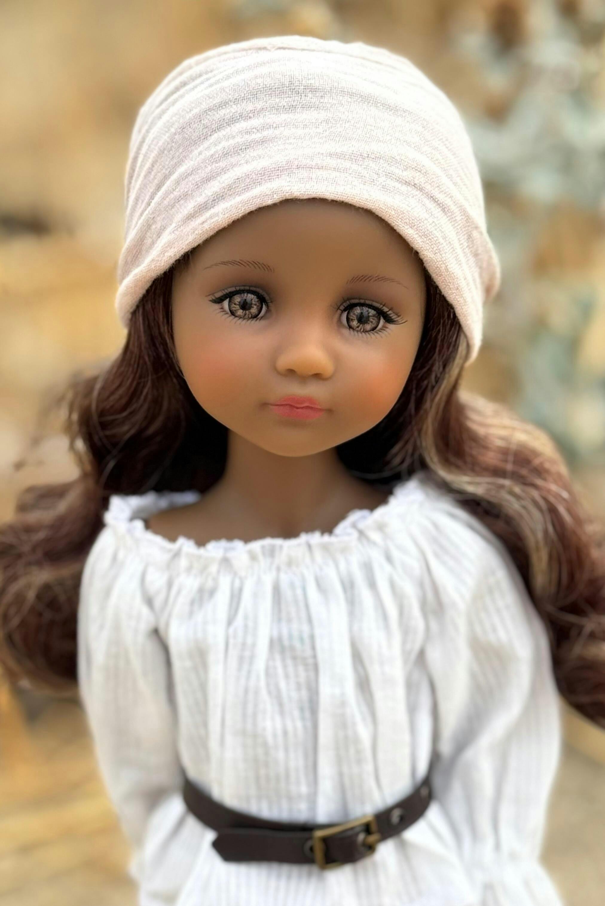 Meet Grace, the fashionista of winter wonder! She’s wrapped in a stunning purple coat adorned with sparkling mini gemstones and fluffy white borders that add a touch of elegance. She also has on a soft, textured white dress that’s super chic.