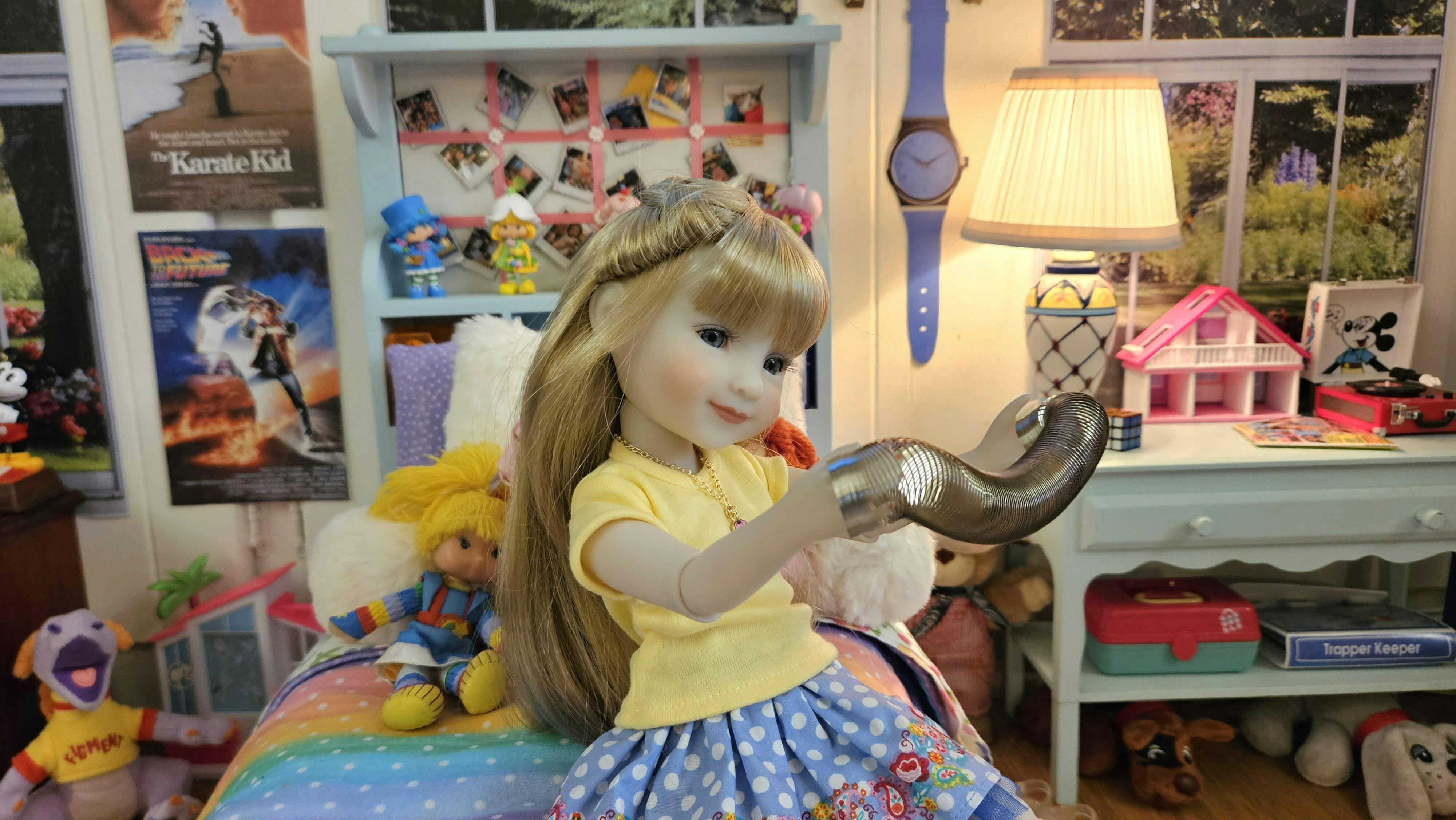 Sara features very long blonde hair that comes well past her waist, with a long wrap-around braid and she has light blue eyes. Sara comes with her signature Let Your Light Shine shirt, along with her fabulous fashion denim jacket, the latest jeans, and floral sneakers.