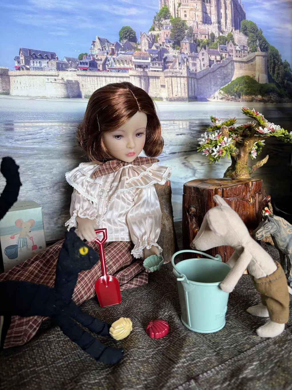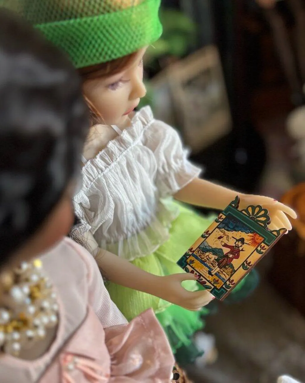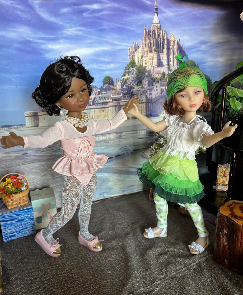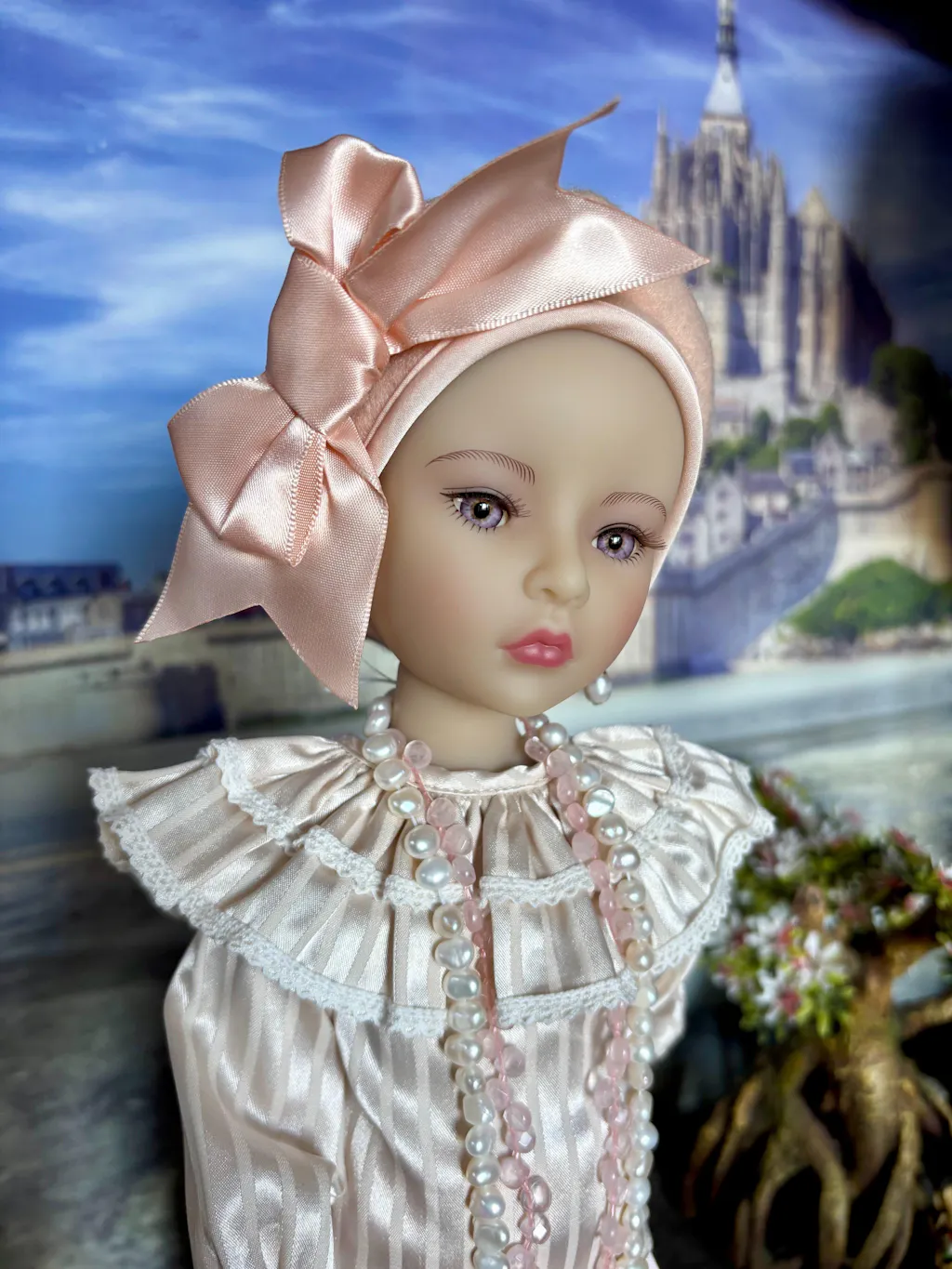 Her soft pink outfit, featuring a strapless bustier and a pleated skirt, captures innocence and charm, while lace tights add an elegant finish. Complete with stylish flats and meticulously crafted accessories, including a *pearl necklace and a fashionable handbag, Lou epitomizes luxury and artistry.