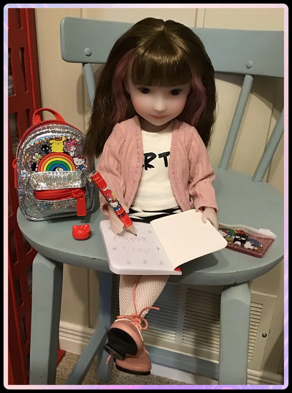 Take the art world by storm with Sunny! This 12-inch doll is part of our Siblies line, they are the little brothers and sisters of the Fashion Friends. This beautiful doll has luscious brown hair with peek-a-boo pink high-lights and is fully posable, with nine points of articulation.